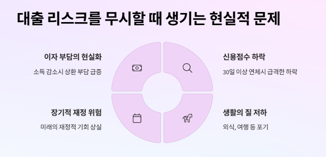 ✔️ 장기적 재정 위험 도 큽니다. 신용점수가 낮아지면, 이후 자동차 할부금리나 신용카드 발급도 불리해집니다. 결국, 대출 리스크를 무시한 결과가 ‘지금 당장’의 상환 문제를 넘어 미래의 재정적 기회 상실 로까지 이어질 수 있다는 점을 꼭 기억하세요.