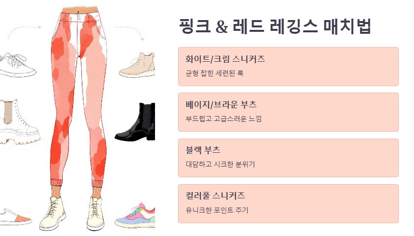 핑크나 레드 레깅스를 입을 때 너무 튀는 신발을 신으면 전체적인 스타일이 과해 보일 수 있습니다. 이럴 때는 베이지나 브라운 계열의 부츠를 선택하면 한층 더 부드럽고 고급스러운 느낌을 줄 수 있습니다.